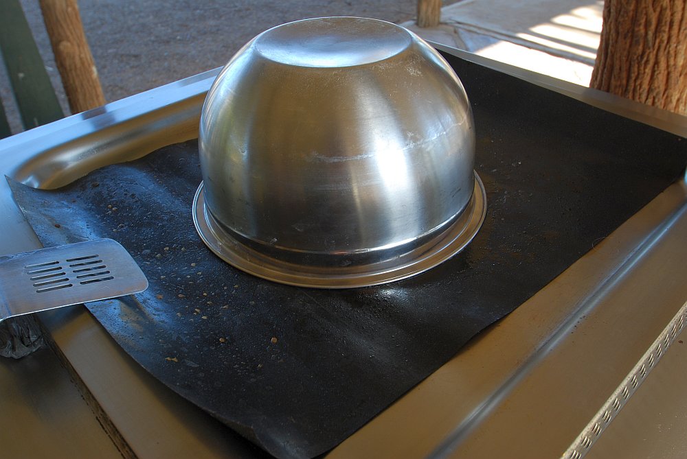 I made the loaf fairly flat and allowed it to do the second rise on the non stick BBQ liner, on top of the barbecue plate. When risen sufficiently, I started the gas, covering the loaf with a stainless steel bowl to try and keep the heat in a bit.