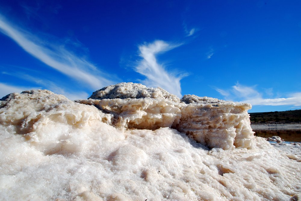 The wind causes ripples that splash any twigs and rocks with super saturated salt water which dries in the wind and sun to form salt crystals. The salt also crystallizes out on the muddy bed of the waterhole, leaving a tough crust of salt both above and below the water level as evaporation continues both in the creek and the lake.